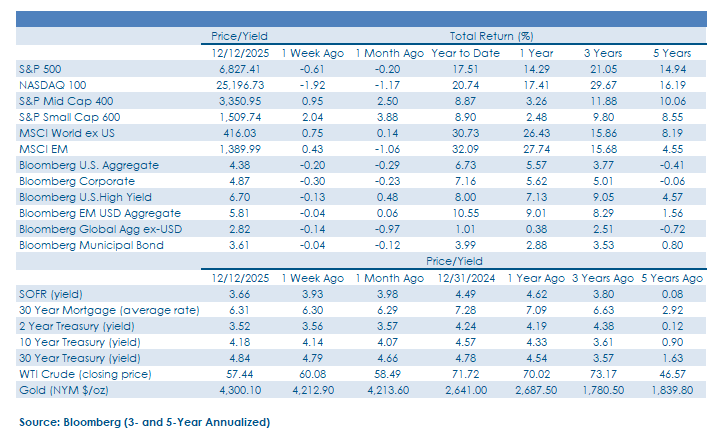 FOMC In ‘Wait And See’ Mode After Another Rate Cut, But Chair Powell Left The Door Cracked For Another Cut In January. As expected, the Federal Open Market Committee (FOMC) delivered a 25-basis point rate cut at its December meeting, leading to a rally in stocks and bonds as investors in both asset classes heard or saw something they liked. The decision to cut the funds rate wasn’t a unanimous one as there were three dissents with two voters opting for no cut, while one pushed for 50-bps. We were expecting a couple more dissents in the camp of no cut, so we were a bit surprised that the consensus swung so far to the easing side of the ledger. The FOMC’s updated dot plot, or median Committee member’s forecast for various economic data points, painted something of a Goldilocks picture for the coming year. The dot plot projects the unemployment rate to remain steady at 4.4% in ’26, inflation (core PCE) to fall to 2.4%, and for U.S. economic growth to pick up to 2.3% as the Committee pushed 0.2% from 4Q25 due to the government shutdown into the new year. The FOMC also announced it would begin buying $40B per month of short-term bills, allowing for purchases of bonds maturing inside of 3-years to maintain ample reserves and bolster liquidity in the banking system. This $40B per month in purchases appears larger than most economists and central bank pundits were projecting, and the bond market initially appeared to view this move as potentially forcing fixed income investors farther out on the Treasury curve and serving to increase demand for long bonds, but that initial stance appeared to shift into the weekend as yields on long-term Treasuries moved back to multi-month highs on Friday. Chair Powell’s post-meeting remarks were decidedly more ‘dovish’ than we expected, and markets took their cue from a statement he made surrounding his belief that payrolls growth has been overstated by 60k in recent months to imply he could get on board with another rate cut early next year if the labor market data justifies such a move.