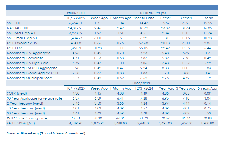 U.S. Indices On Healthier Footing Into Year-End After Last Week’s Positioning, Sentiment Shift. The U.S. and China continued to trade jabs surrounding China’s curbs on exports of rare earth minerals which are used in a broad swath of high-tech applications. This is a hot button issue in Washington D.C. due to negative implications for the U.S. military industrial complex should rare earth minerals need to be sourced elsewhere. This led to concerns that a trade war between the two countries was potentially back on after a six-month hiatus. While trade rhetoric dominated headlines early in the week, it took a back seat to credit concerns as comments made by J.P. Morgan’s CEO, along with a couple of smaller regional banks reporting credit losses tied to alleged fraud, led to concerns that some recent high profile bankruptcies could be just the tip of the iceberg with more “cockroaches” likely to come into the light in due time. Trade and credit concerns weighed on risk appetite over the balance of the week, but the S&P 500 still managed to eke out a 1.7% weekly return and recoup some of the prior week’s losses, while small cap stocks fared even better. We suspect credit concerns will subside, but it may take another week or two for positioning and sentiment to sufficiently reset after such a sizable and unchecked move higher for U.S. indices off the April lows. We remain constructive on U.S. stocks into year-end and expect quarterly earnings and a reopening of the corporate buyback window to ultimately turn the tide back toward the bullish camp, but it may be November before we see those tailwinds materialize.